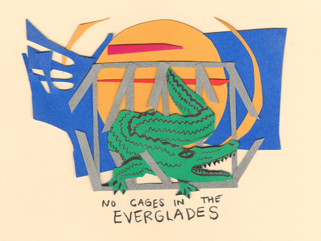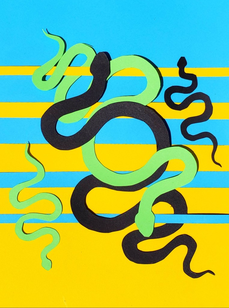 CONSTRUCTION PAPER CUTOUT FOR ORGANIZED COMMUNITIES AGAINST DEPORTATION’S #IMAGININGLIBERATION CALL TO IMAGINE A WORLD WITHOUT IMMIGRATION ENFORCEMENT. SNAKES, A SYMBOL OF TRANSFORMATION, TRAVEL ACROSS DIFFUSE BORDERS WITH THEIR YOUNG.